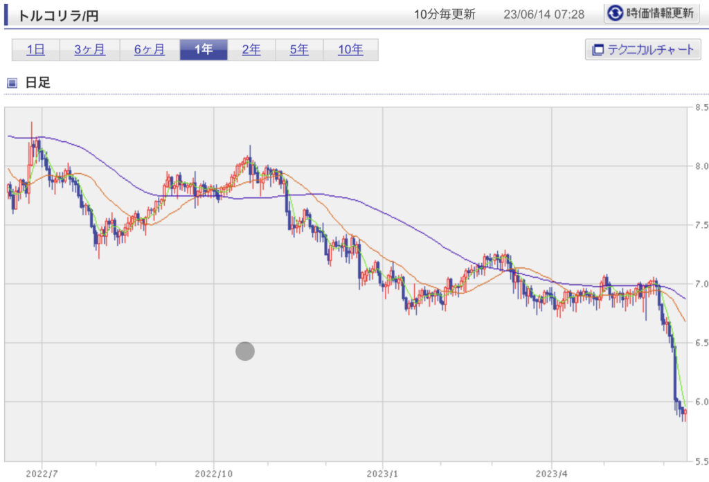 10年前は1トルコリラ50円程あったものが、今では5円台まで下がっています。